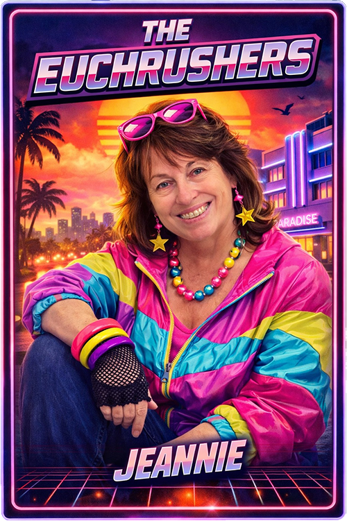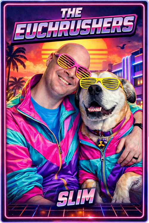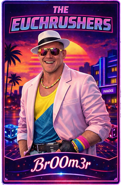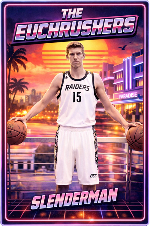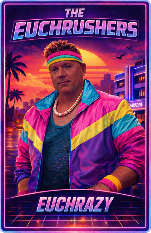 The Euchrushers are an over-the-top, pixel-powered Euchre squad known for smashing loner defenses and crushing tacos. Led by Captain Euchrazy, the roster blends raw power, quirky personalities, and big-screen energy. Each member brings their own flair, but together they dominate league with style, trick-taking swagger, and of course a whole lot of Crazy.